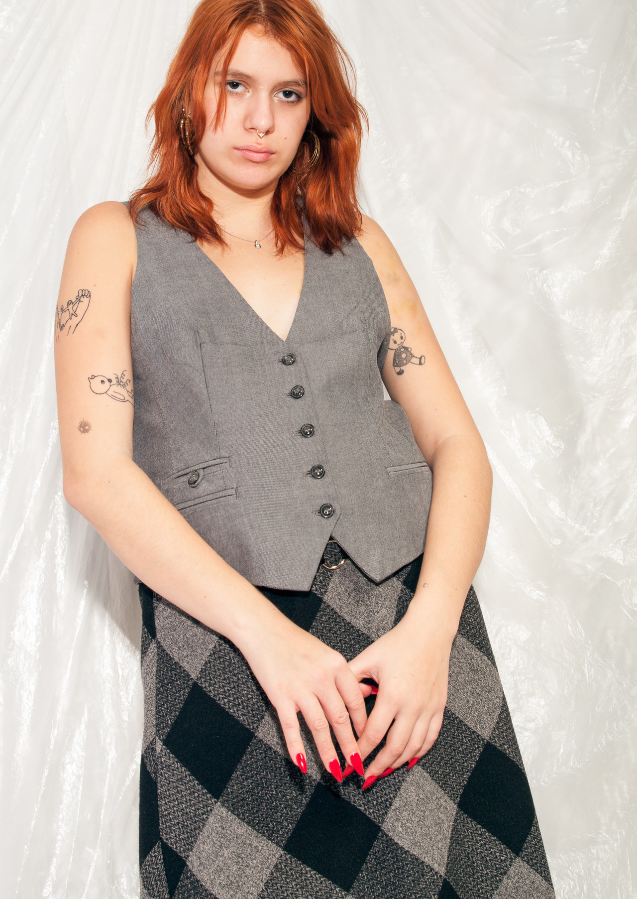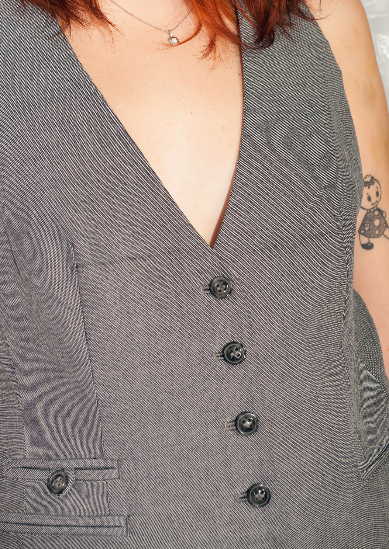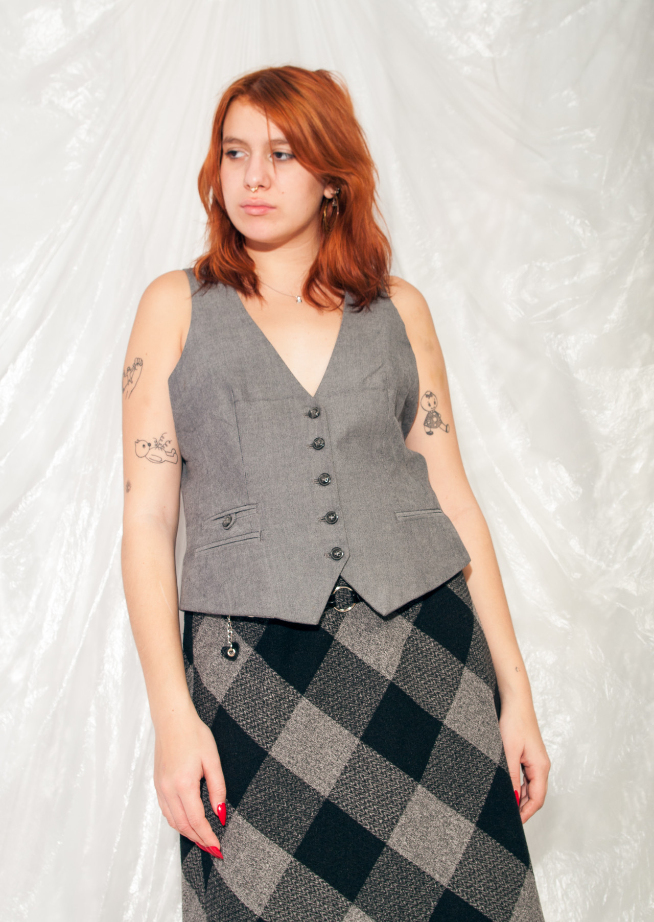 Preppy Y2K vintage vest, the next piece of your sustainable wardrobe. Featuring a button closure and soft grey cotton blend fabric. It’s fully lined.