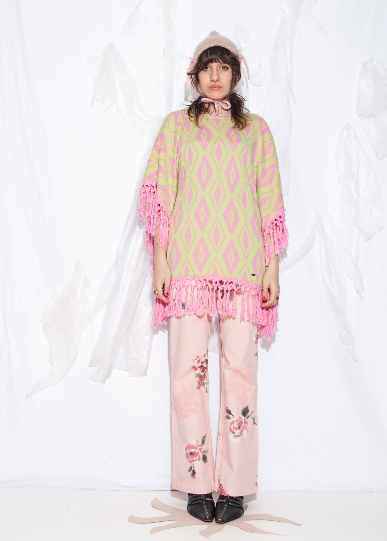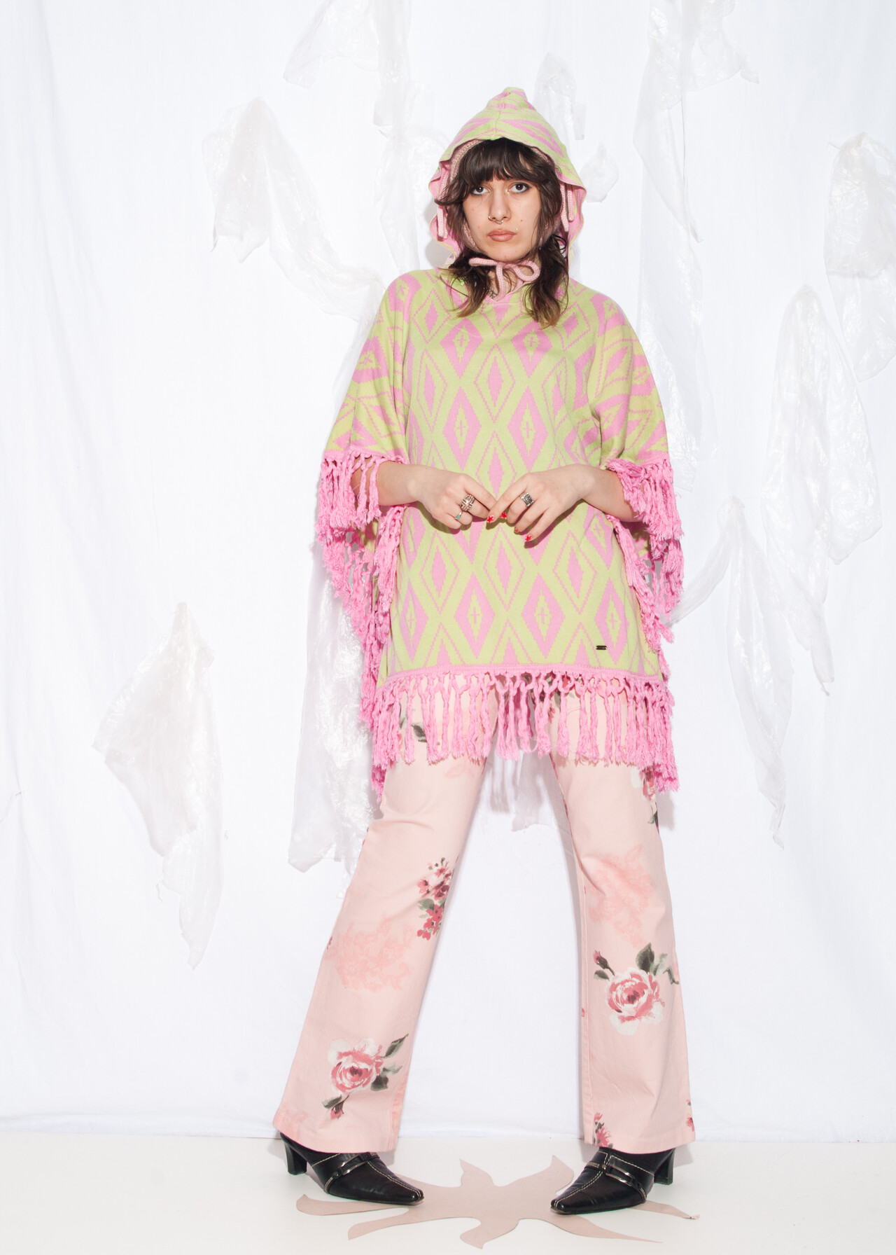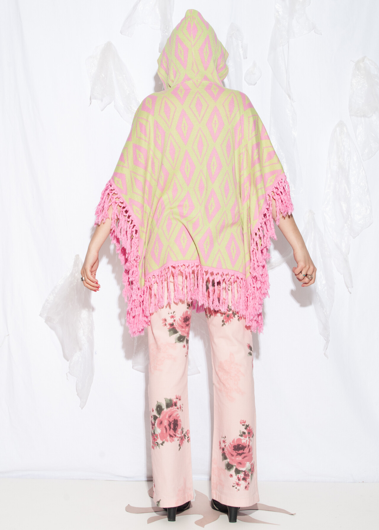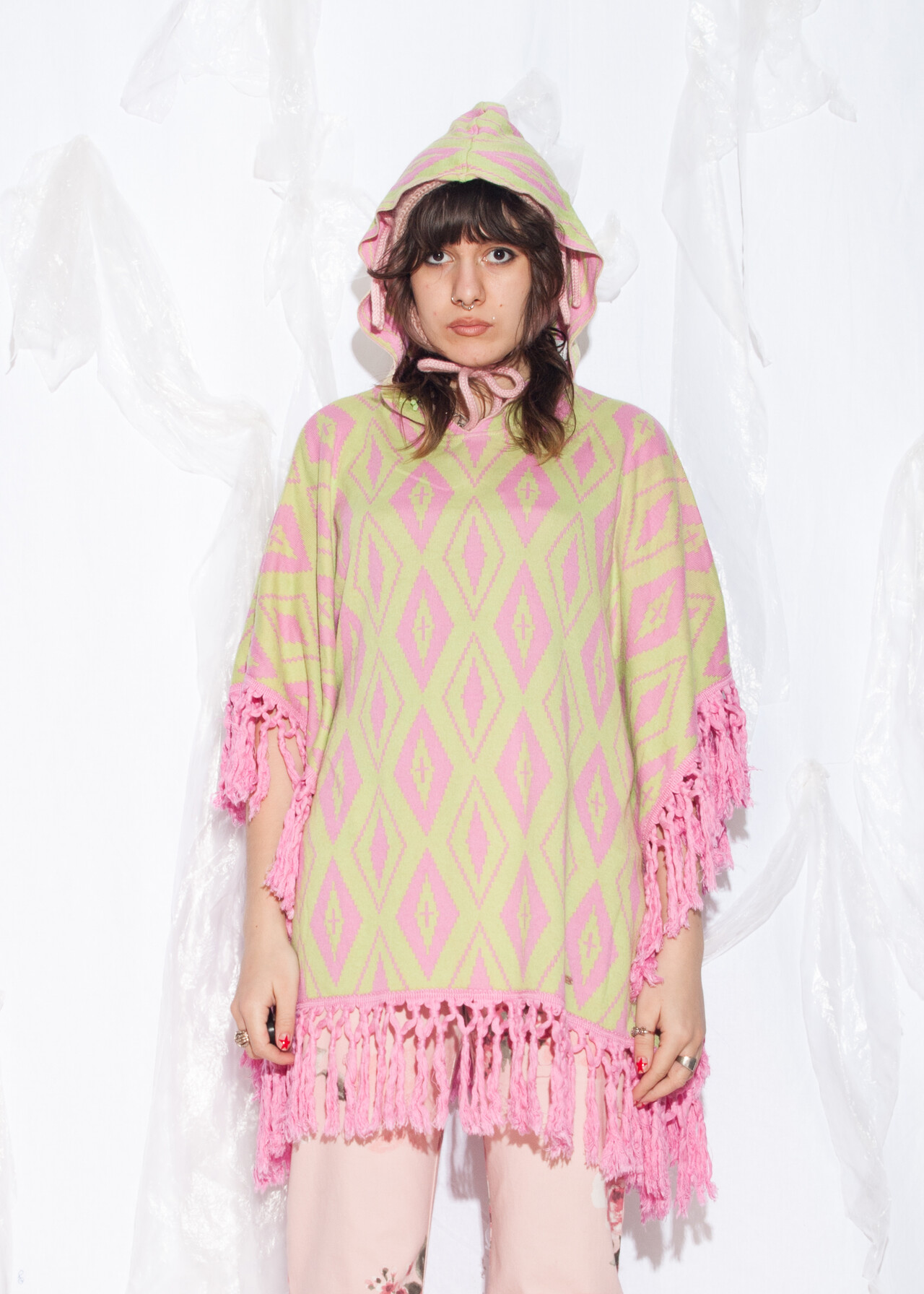 Tags: 2000s vintage style, hooded cape, knitted poncho, neon argyle pattern
