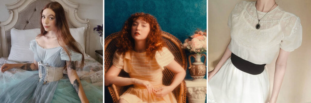 This one fetishizes the turn of the century ​​fin de siècle mood. It’s hard to differentiate it from fairycore and cottagecore, antique has the frills and all those romantic details as well — but without the butterfly wings and straw bales.